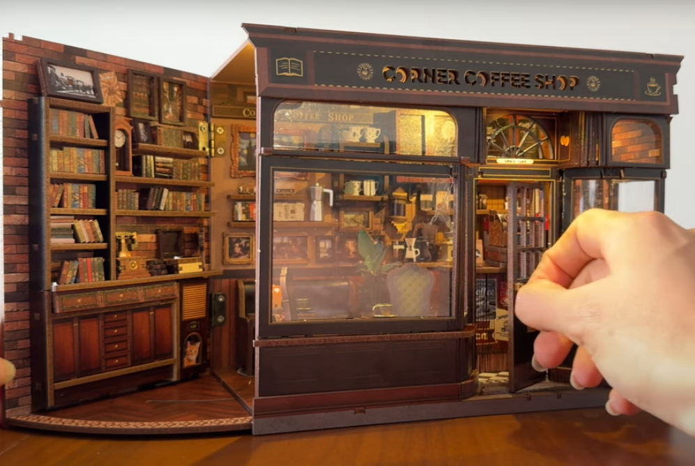 I got the Corner Coffee Shop nook and it looks even better in person. The details are so crisp and the warm light makes my bookshelf feel magical at night. Assembly took me a chill afternoon.