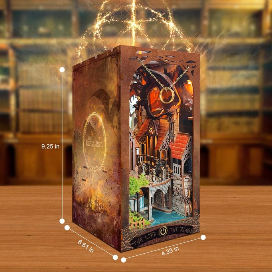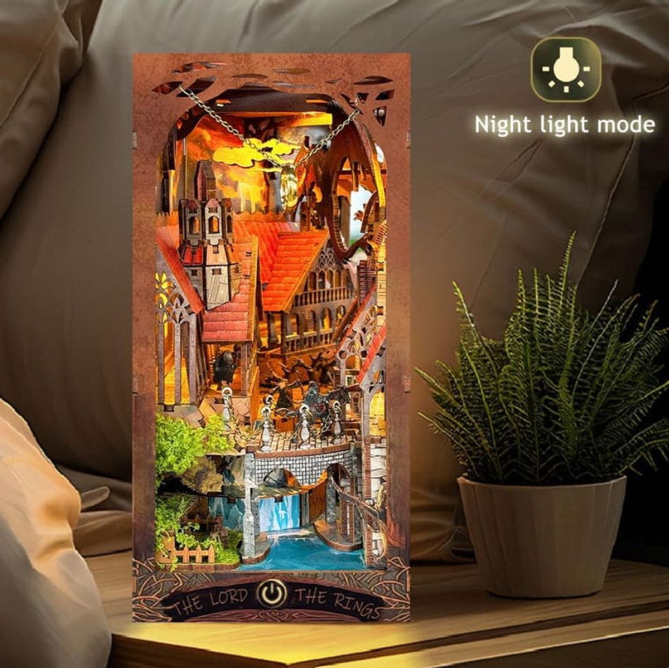This LOTR-inspired book nook is absolutely stunning in person—the layered scenery gives real depth, and the warm glow makes it feel like you’re peeking into a tiny fantasy village. The build was fun and satisfying, and once lit up it instantly became my favourite piece on the bookshelf.